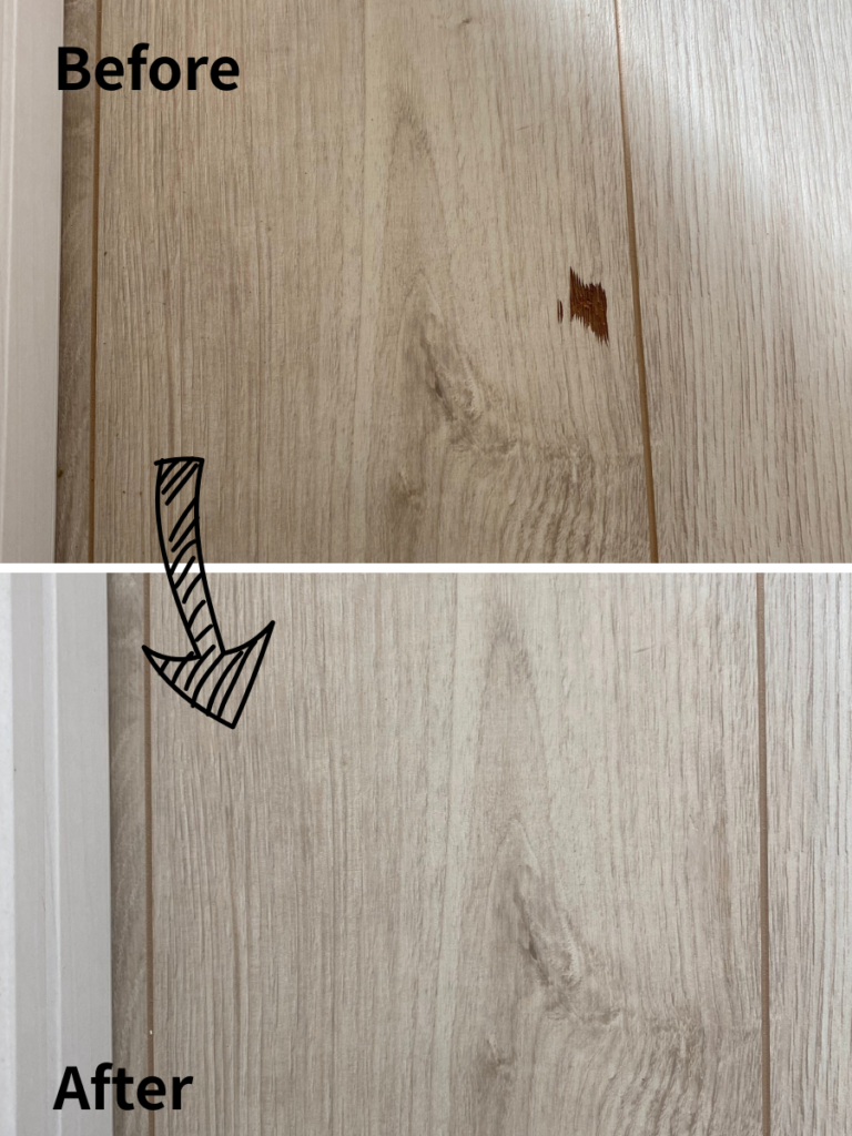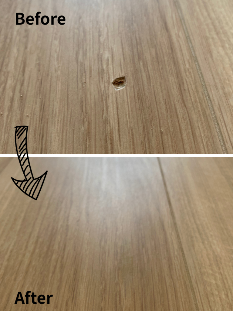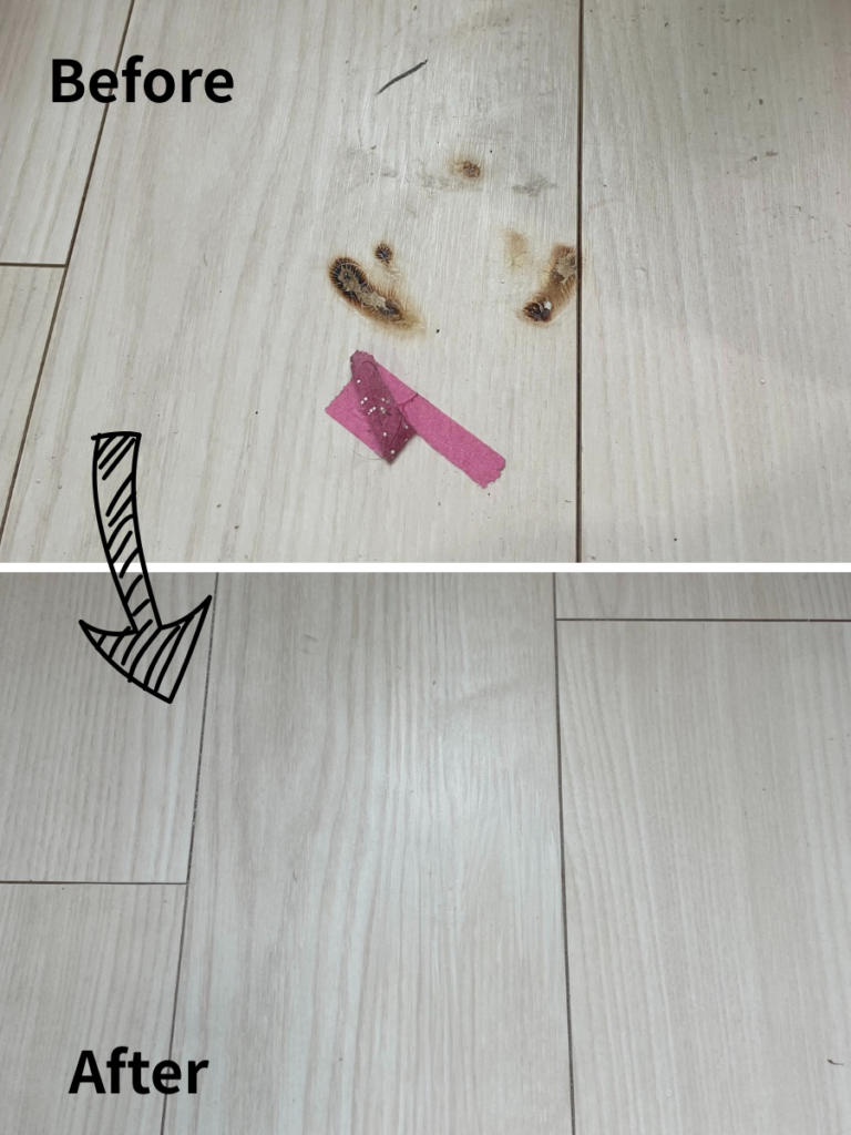 床の焦げは、一部だけでも張り替えとなると大掛かりな工事になり、費用も高額になりがちです。炭化した部分を丁寧に取り除き、特殊な樹脂で平滑に成形。周囲の色と木目に合わせて一筆ずつ描き込み、表面の質感(ツヤ)まで再現しました!
