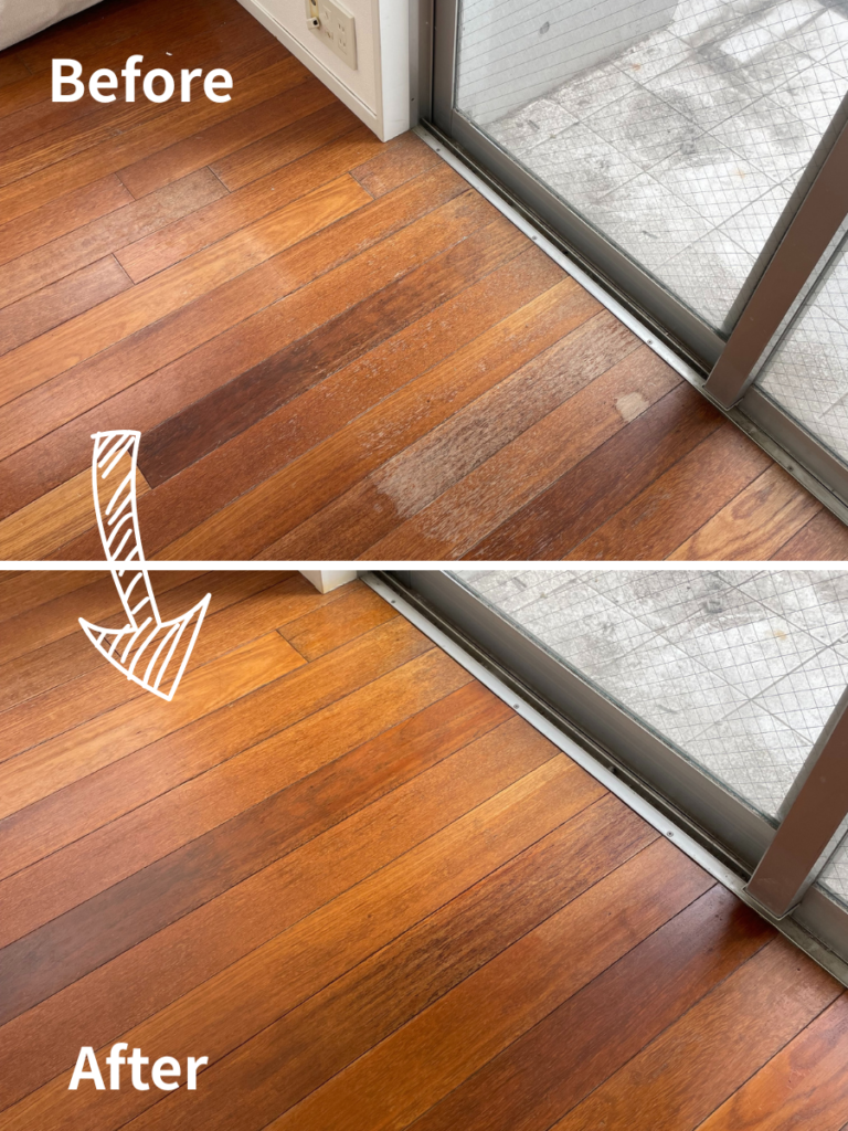 直射日光により、表面の塗装が剥がれて色褪せしてしまったフローリングの補修です。劣化した塗膜を丁寧に取り除き、周囲の明るい色調に合わせて繊細に調色した色を重ねることで、自然な風合いを復元しました。