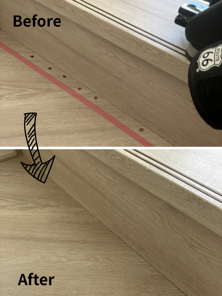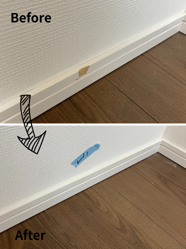 欠損した角の部分を一からパテで成形し、周囲の色と木目(または単色)を精密に再現して塗装いたしました。幅木を交換する場合、壁紙まで干渉してしまうことがありますが、リペアなら壁を傷めず、最小限の範囲で元通りに復元可能です。