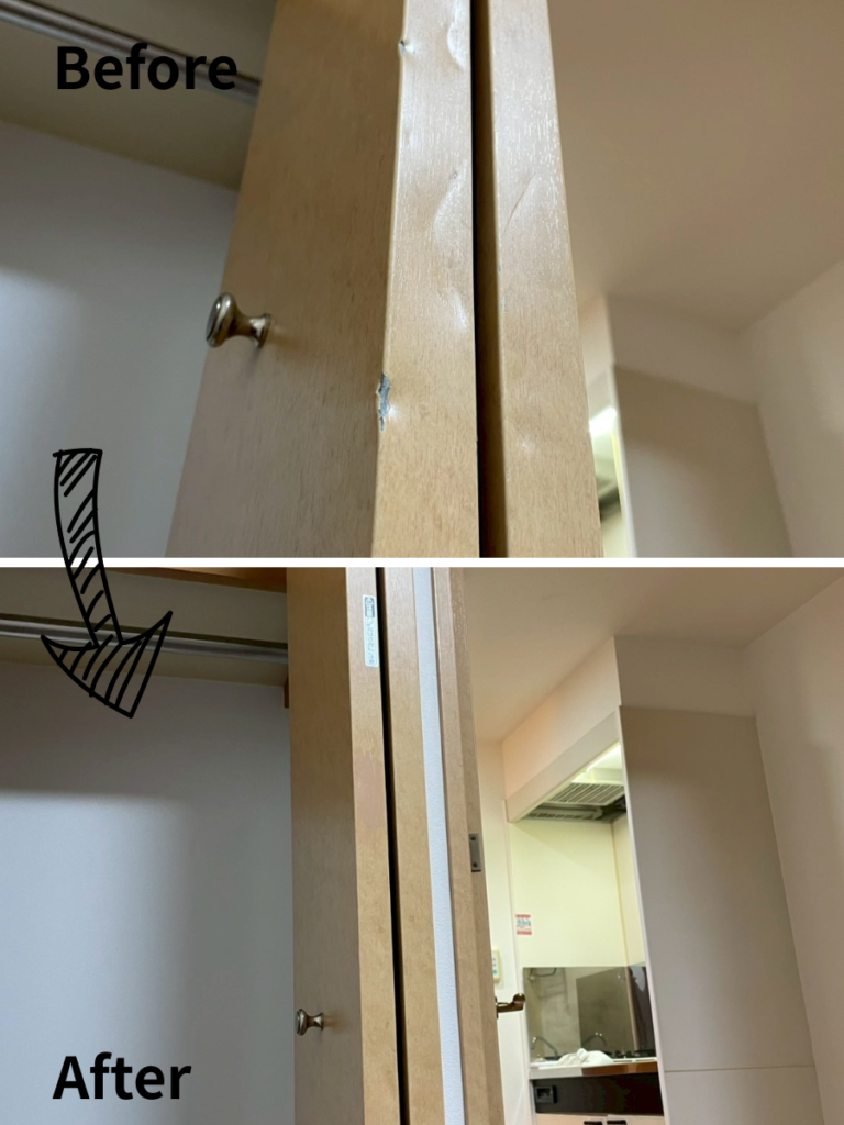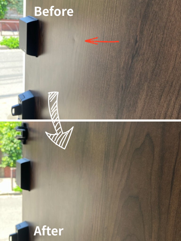 玄関は「住まいの顔」とも言える大切な場所ですよね。光が当たると目立ちやすい凹みも、専用パテで緻密に面出し(平滑化)を行い、周囲と完全に馴染むよう特殊塗装で仕上げています。違和感のない滑らかな仕上がりになりました!