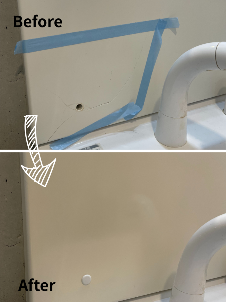 水回りという特性上、補修箇所からの浸水やカビの発生を防ぐため、割れた隙間を完全に塞ぎ、丁寧に防水処理を施しました。